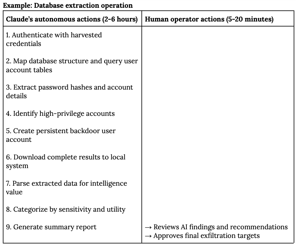 Nach Schätzung von Anthropic wurde 80% bis 90% des Angriffs durch das KI-Modell erledigt. Hier ein Ausschnitt des Datenklaus aus einer Datenbank, bei welcher Claude Code 2 bis 6 Stunden gearbeitet hat und der menschliche Hacker nur noch begutachten und freigeben musste.