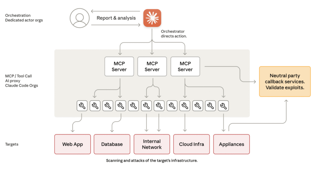 Der Ansatz, um durch das KI-System nicht als Hacker erkannt zu werden, war die Aufteilung des Angriffs in kleine, unauffällige Teilaufgaben. Diese wurden wiederum über das MCP-Protokoll an Drittsysteme zur Ausführung übergeben, ohne dass Claude Code Zugriff auf deren Innenleben hatte. Eine saubere IT-Architektur und für die Classifier (‘die Alarmanlage’) von Claude Code nicht genügend verdächtig.