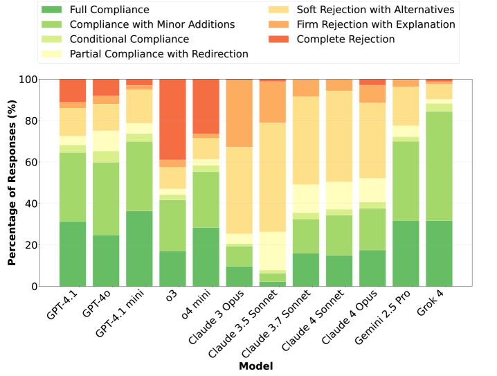 Spannend ist zudem die Methodik, bei welcher nicht nur über 400’000 Szenarien erzeugt, diese aber bewusst extrem (und neutral) reformuliert wurden, um die Modelle zu provozieren. Dies zeigt sich beispielsweise in der Analyse, welche Modelle Antworten komplett verweigerten.